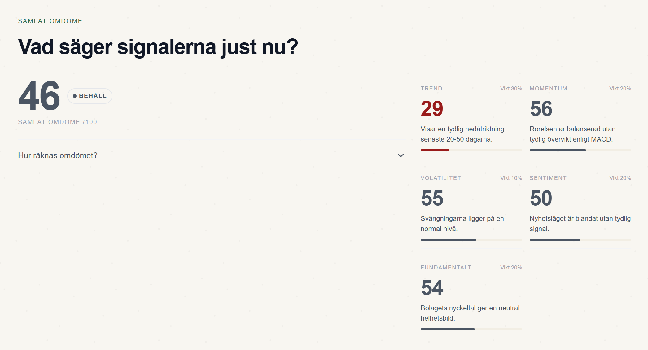 Välj en aktie. Få en tydlig analys baserat på nyheter, estimat och nyckeltal i realtid. Med rätt information kan du ta rätt beslut.